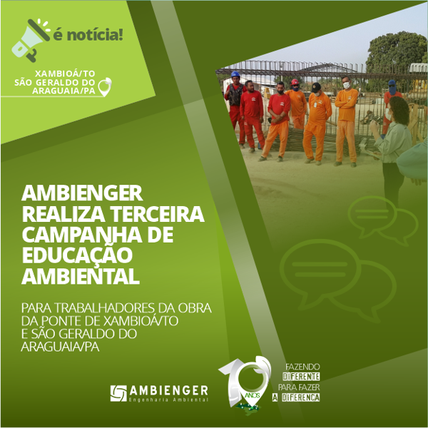 A 3ª Campanha de Educação Ambiental da Ponte Xambioá-TO / São Geraldo do Araguaia-PA, aconteceu no dia 16 do mês de outubro de 2020, contando com a participação de 55 trabalhadores da obra e as informações e conteúdos foram transmitidos via diálogo no pátio do canteiro de obras, com palestras promovidas pela equipe do PEA e da Gestão Ambiental da obra, concomitante com a equipe de segurança do trabalho do Canteiro de Obras, que realiza semanalmente os DDS (Diálogos Diários de Segurança).