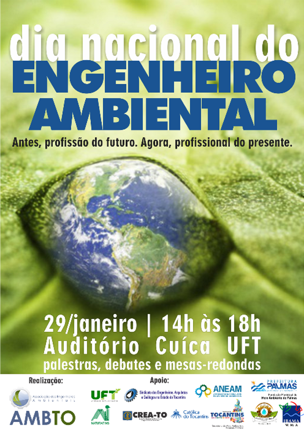 Nesta sexta-feira, 29, a Associação de Engenheiros Ambientais do Tocantins – AMBTO realizará evento comemorativo ao Dia do Engenheiro Ambiental, lembrado em 31 de janeiro. Na programação, serão discutidos assuntos como atribuições profissionais, mercado de trabalho, Programas Especiais na Engenharia Ambiental – PET, e haverá mesa-redonda para debate entre os órgãos de controle ambiental Instituto Brasileiro do Meio Ambiente e dos Recursos Naturais Renováveis - Ibama, Instituto Natureza do Tocantins - Naturatins e Fundação Municipal de Meio Ambiente - FMA.