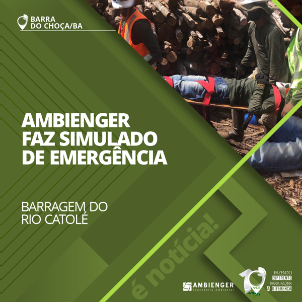 A Ambienger fez um simulado de emergência na Barragem do Rio Catolé para representar de forma realista uma situação de risco, fazendo com que todos trabalhadores envolvidos seguissem os mesmos passos que devem ser seguidos em um caso real, porém participando de um treinamento prático orientado pela equipe de engenharia de segurança. Neste trabalho a descrição da situação era que o Colaborador estava segregando e empilhando toras de madeira na frente de serviço (poligonal III de supressão vegetal da bacia hidráulica do rio Catolé – BHRCA), quando uma das toras despencou e atingiu a perna esquerda do colaborador, causando uma fratura na tíbia.